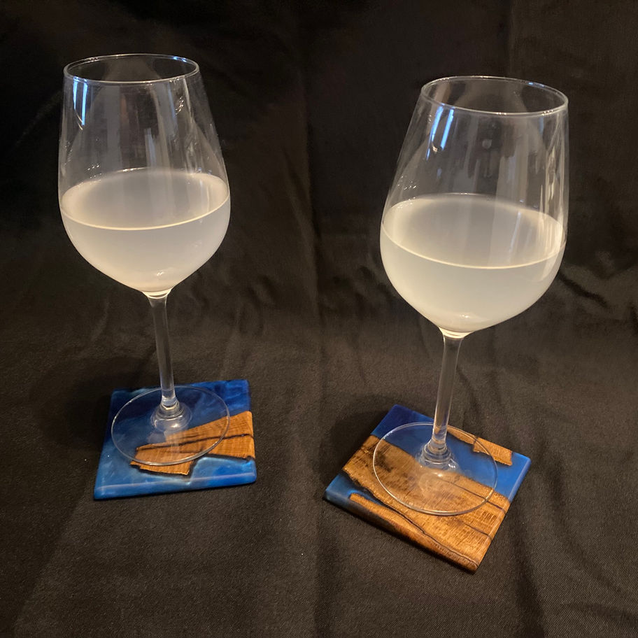 Dessous de verre en chêne et résine époxy bleue transparente.